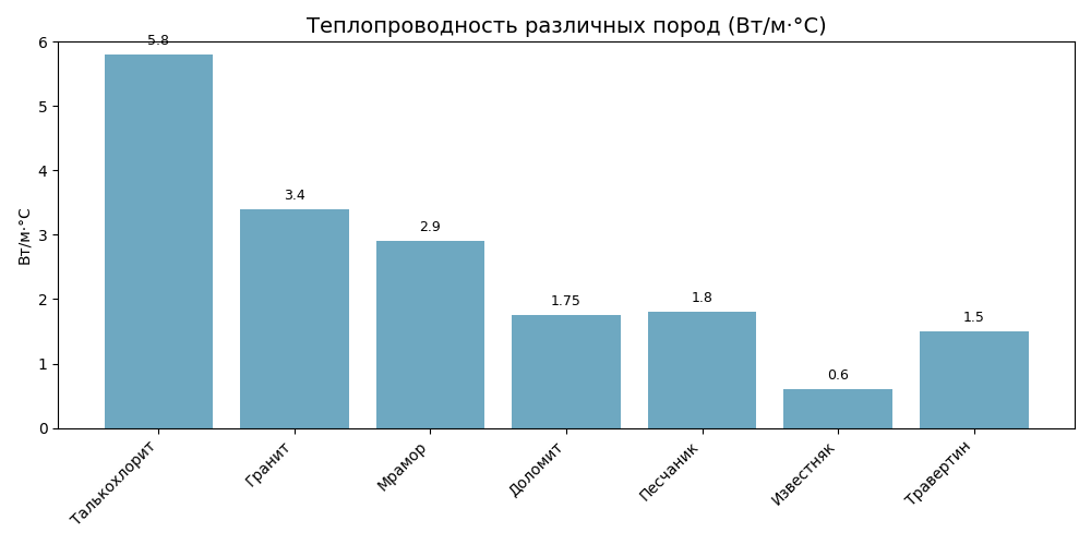 Перед тем как сравнить породы в таблице, полезно взглянуть на диаграмму теплопроводности. На ней видно, что талькохлорит лидирует по способности проводить тепло, за ним следуют гранит и мрамор, а известняк обладает самой низкой теплопроводностью. Такой наглядный график поможет быстрее определиться с выбором материала в зависимости от задач камина..