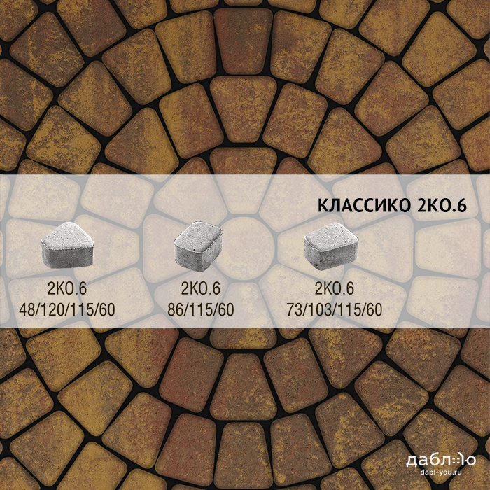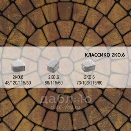 Брусчатка Выбор Классико Листопад 2КО.6 М Осень. Бетонная тротуарная плитка из серии Классико. Эта коллекция отличается сходством с натуральным камнем и правильной геометрической формой.Высота: 60 мм