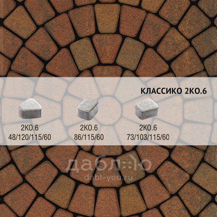 Брусчатка Выбор Классико Листопад гранит 2КО.6 М Арабская ночь. Бетонная тротуарная плитка из серии Классико. Эта коллекция отличается сходством с натуральным камнем и правильной геометрической формой.Высота: 60 мм