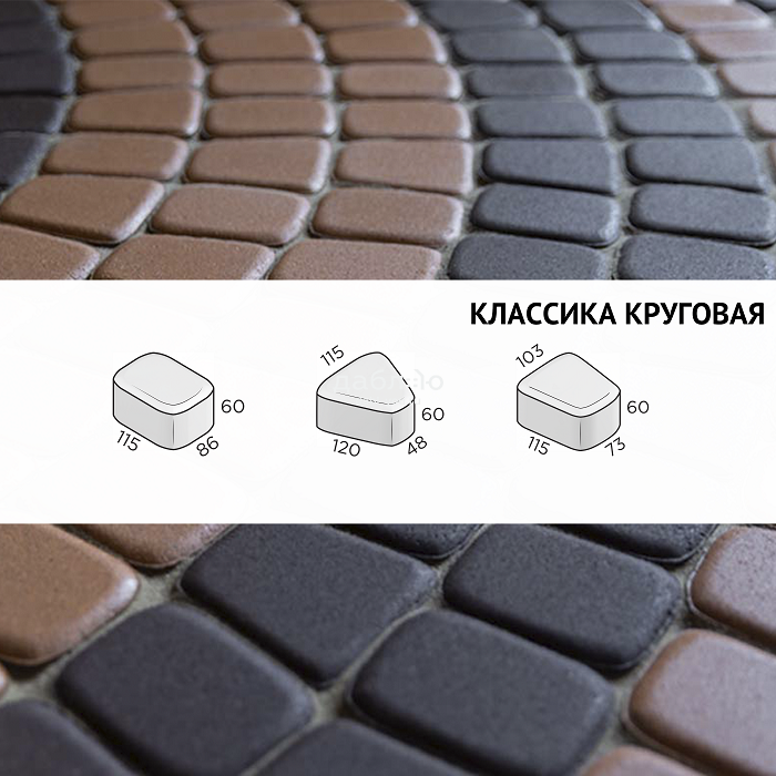 Брусчатка Steingot Классика круговая Темно-коричневая. Тротуарная плитка в классическим стиле с ярко выраженными фасками, состоящая из трех камней разных размеров, которые легко сочетать и создавать красивые узоры на мощении. Форма предназначена для выполнения простых круговых и сложных радиусных узоров. Продажа брусчатки производится кратно целым поддонам!- Высота: 60 мм