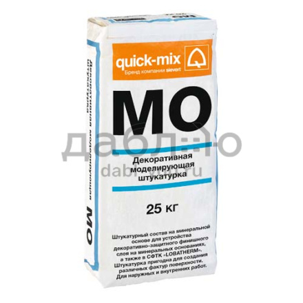 Декоративная моделирующая штукатурка Quick-Mix МО, 25 кг. Штукатурный состав на минеральной основе для устройства декоративно-защитного финишного слоя на минеральных основаниях, а также в СФТК «LOBATHERM». Штукатурка пригодна для создания различных фактур поверхности посредствам использования разных техник структурирования. Для наружных и внутренних работ.- смесь сухая штукатурная декоративная КПII; F50 ГОСТ 33083-2014