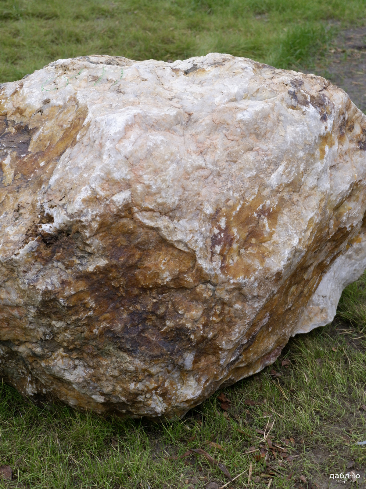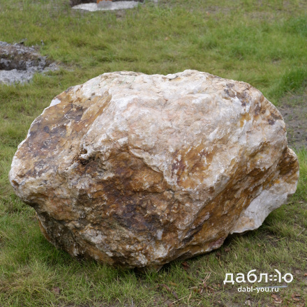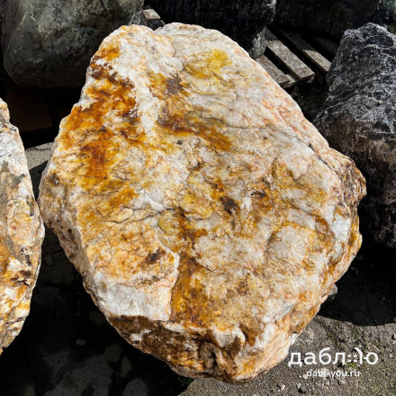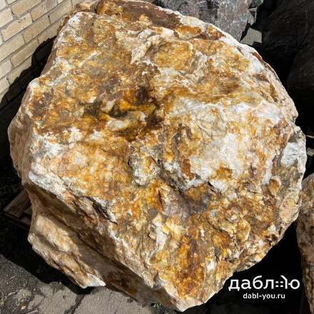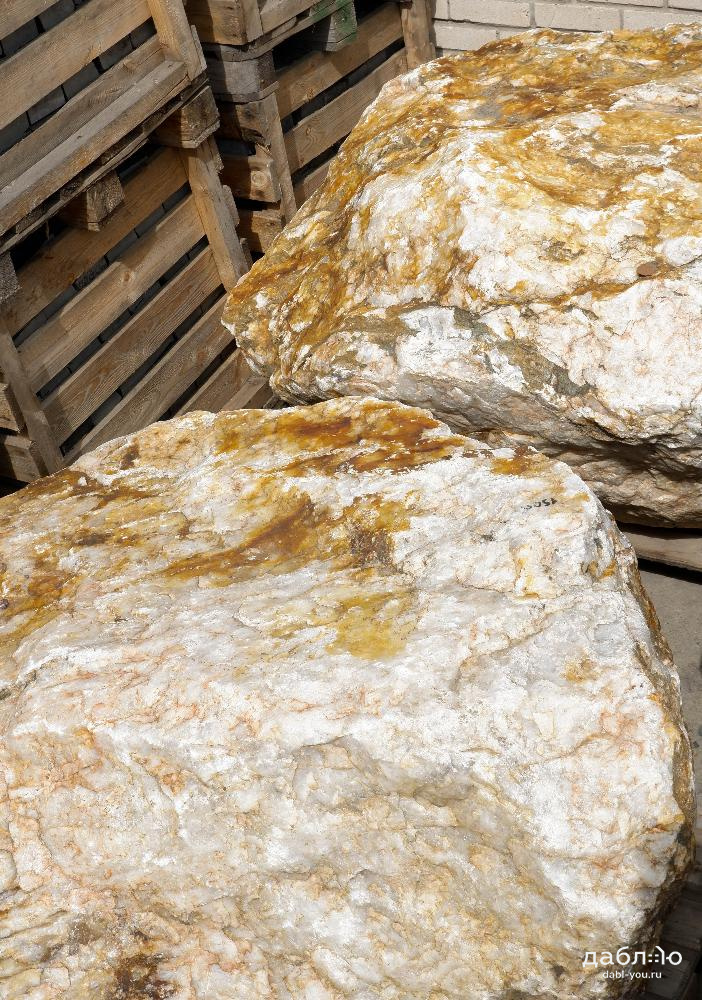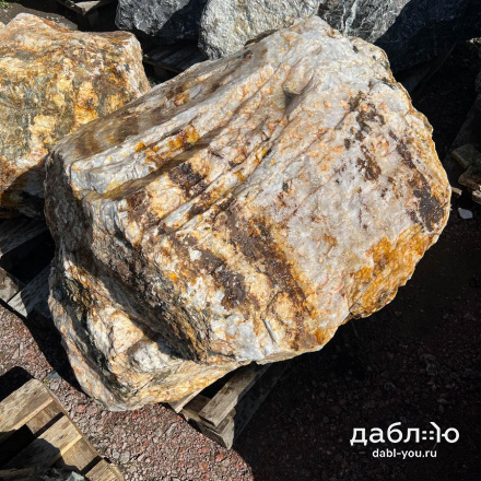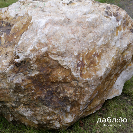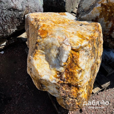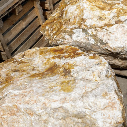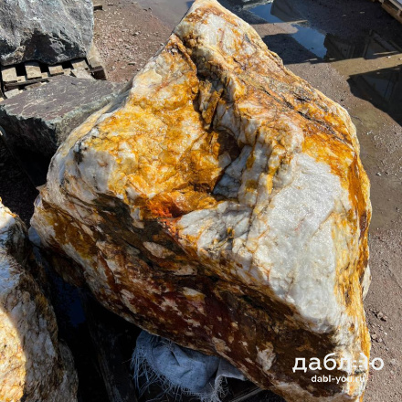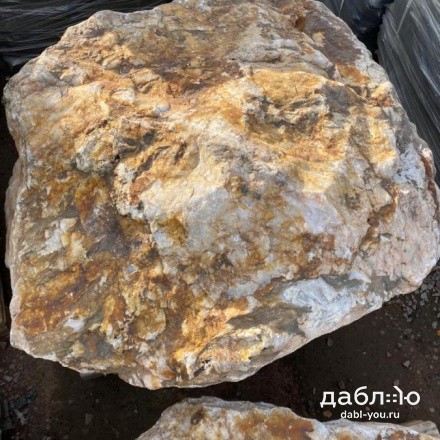 Глыба Кварц с золотом. С помощью данного материала создаются цветники, каменистые сады, фонтаны и многое другое. В ландшафтном дизайне глыбы отлично сочетаются с каменной крошкой и применяются как в виде ландшафтных композиций из нескольких камней, так и в качестве отдельных объектов.Область применения: ландшафт