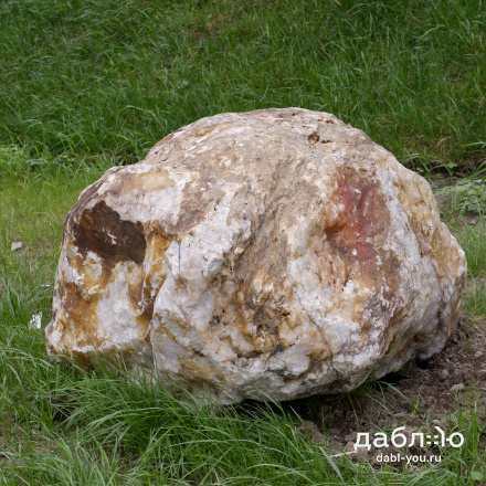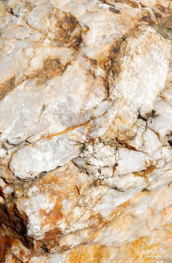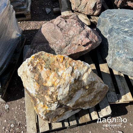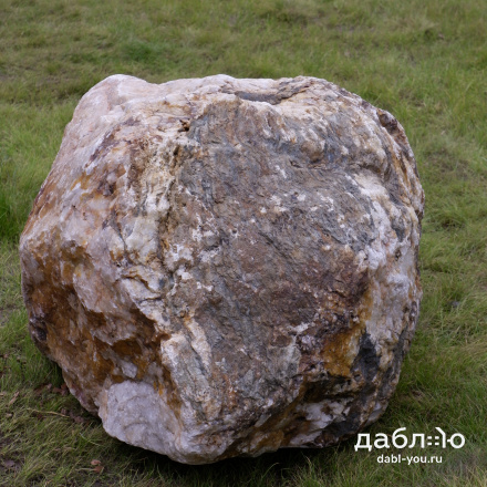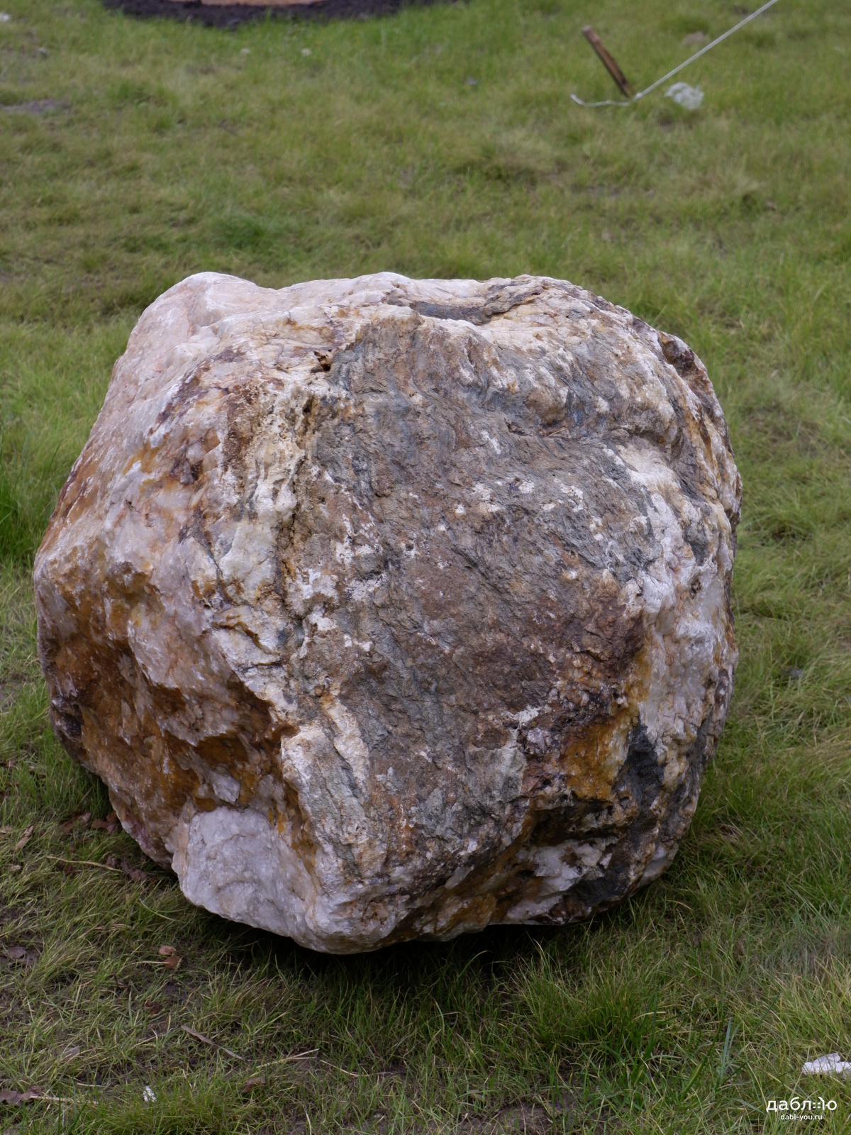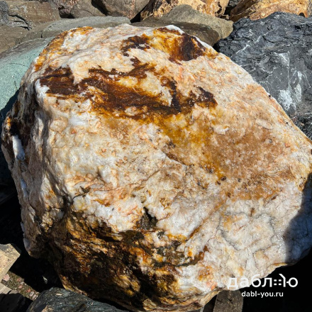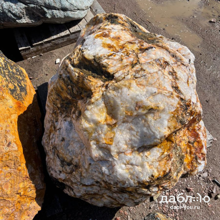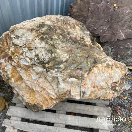 Глыба Кварц с золотом. С помощью данного материала создаются цветники, каменистые сады, фонтаны и многое другое. В ландшафтном дизайне глыбы отлично сочетаются с каменной крошкой и применяются как в виде ландшафтных композиций из нескольких камней, так и в качестве отдельных объектов.Область применения: ландшафт