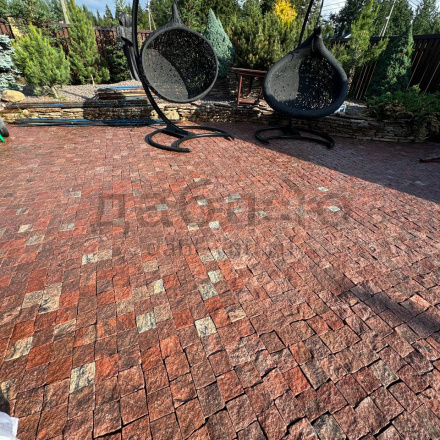 Гранитная брусчатка Сюскюянсаари пилено-колотая (2-4 пиленые боковые грани, верх колотый), размер 100х100х50 мм. Красивый гранит в красном цвете с вкраплениями серого и черного будет отлично смотреться на Вашем участке. Подходит для мощения пешеходных дорожек и парковок.- Цена при отгрузке позиции со склада в Санкт-Петербурге!