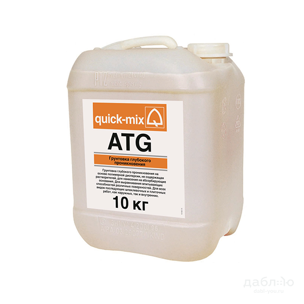 Грунтовка глубокого проникновения Quick-Mix ATG. Грунтовка глубокого проникновения на основе искусственных смол, не содержащая растворителей, для нанесения на абсорбирующие основания. Для выравнивания впитывающей способности различных оснований. Для внутренних и наружных работ.- Плотность 1,0 кг/л