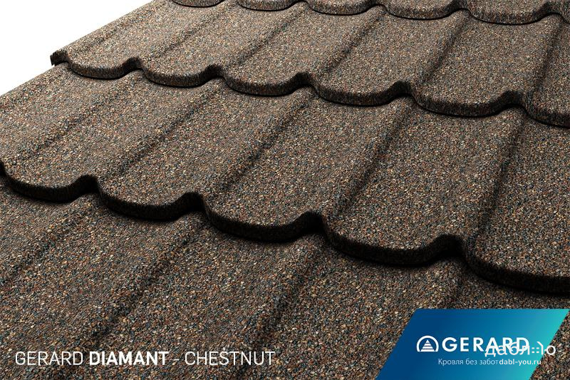 Композитная черепица Gerard Diamant Chestnut, 1270х398 мм. При создании профиля Diamant использовался самый крепкий материал, поэтому эта черепица отличается особой прочностью и при этом экономит для Вас время на установку и расходы. Профиль представлен в 13 различных цветах, чтобы помочь подобрать максимально подходящий для Вас цвет.Размер: 1270х398 мм