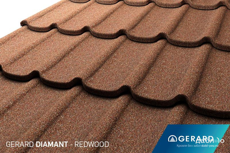 Композитная черепица Gerard Diamant Redwood, 1270х398 мм. При создании профиля Diamant использовался самый крепкий материал, поэтому эта черепица отличается особой прочностью и при этом экономит для Вас время на установку и расходы. Профиль представлен в 13 различных цветах, чтобы помочь подобрать максимально подходящий для Вас цвет.Размер: 1270х398 мм
