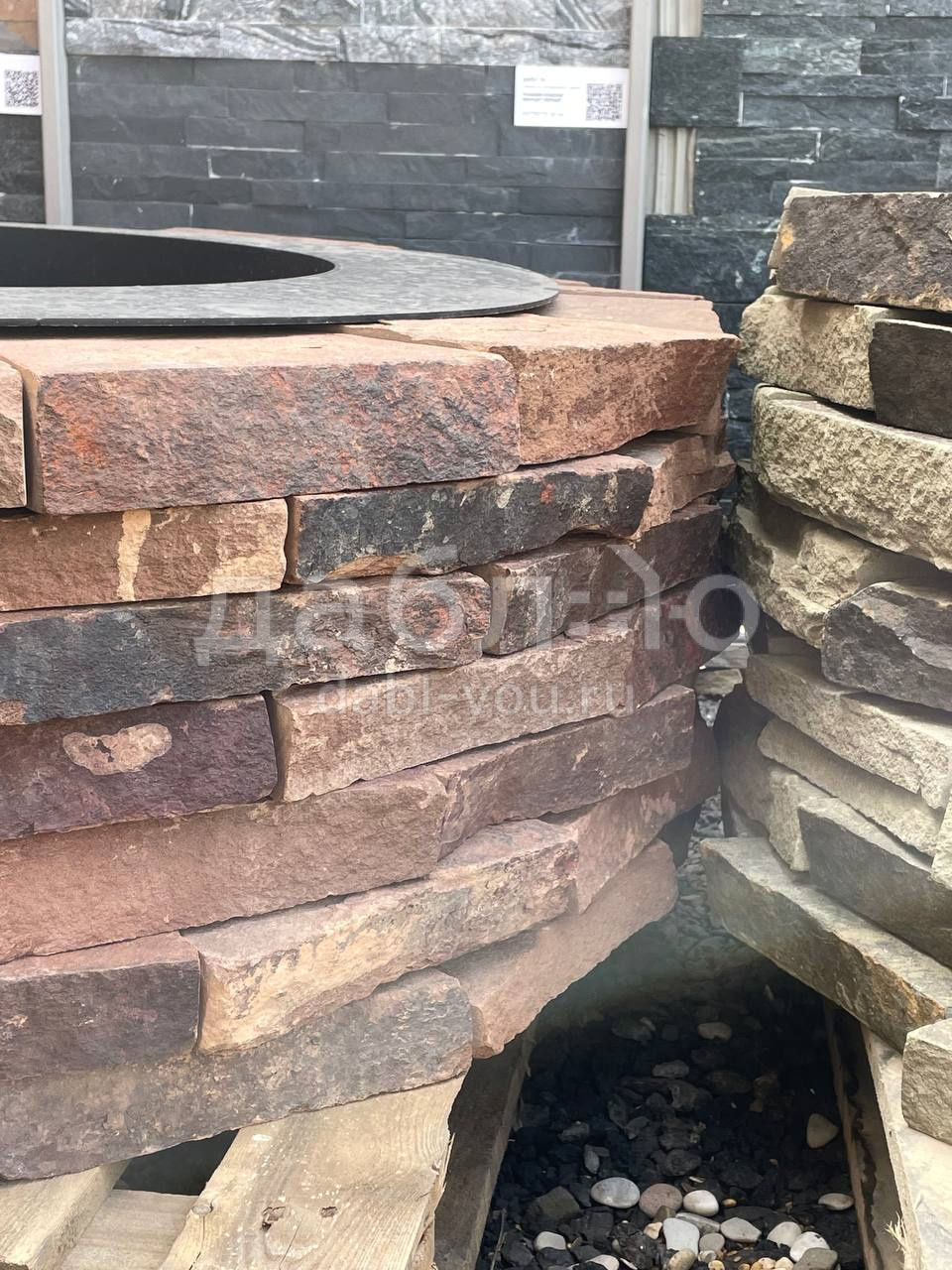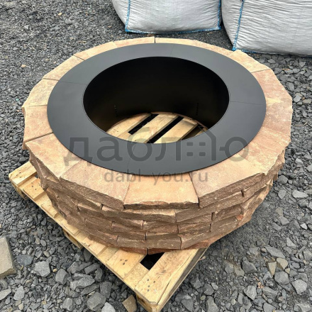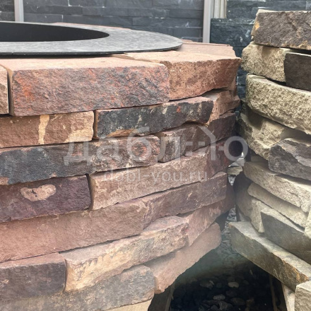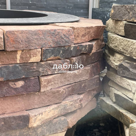 Костровая чаша из красного песчаника с природной текстурой и мягким тёплым оттенком. Теплый цвет камня добавляет уюта и гармонии в зону отдыха, хорошо сочетаясь с деревом и зеленью участка.Фактура: природная