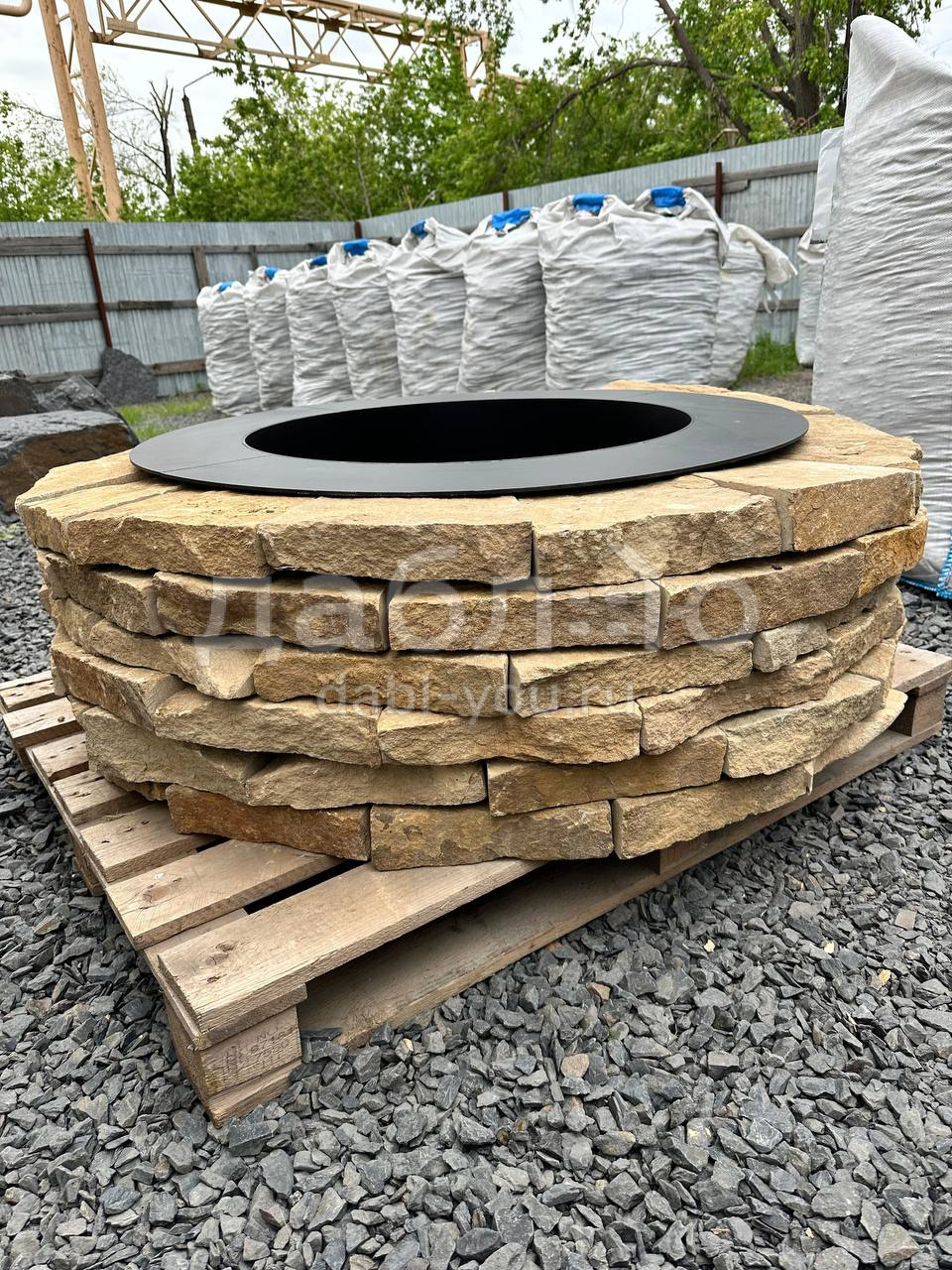Костровая чаша из жёлтого песчаника с природной текстурой и мягким тёплым оттенком. Светлый цвет камня добавляет уюта и гармонии в зону отдыха, хорошо сочетаясь с деревом и зеленью участка.Фактура: природная