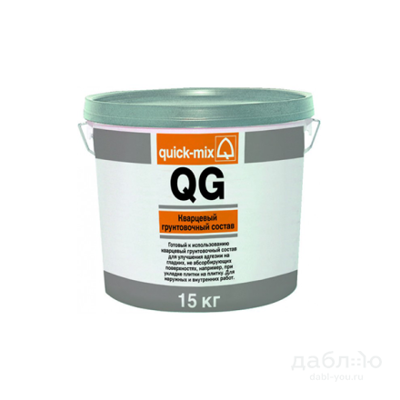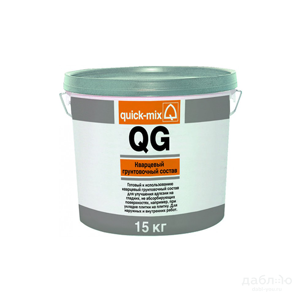 Кварцевый грунтовочный раствор Quick-Mix QG. Готовый к использованию кварцевый грунтовочный раствор для улучшения адгезии декоративных штукатурок в СФТК, а также для создания контактного слоя на гладких, неабсорбирующих поверхностях, например, при укладке плитки на плитку. Для наружных и внутренних работ.- Плотность ~ 1,5 кг/л