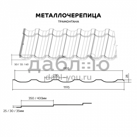 Металлочерепица Металл Профиль Трамонтана. Оптимизированная форма бокового замка позволила увеличить полезную площадь листа. У Трамонтана самая большая рабочая ширина в линейке «Металл Профиль» ― 1155 мм. Это значит, на кровлю понадобится меньше листов и вы сможете сэкономить на количестве материала.Черепица представлена в различных цветах и покрытиях.