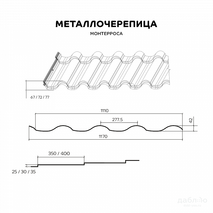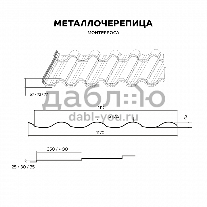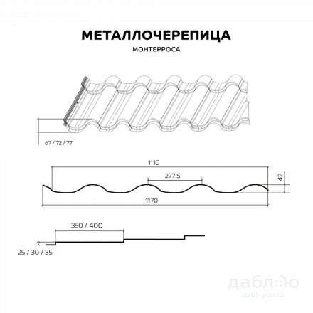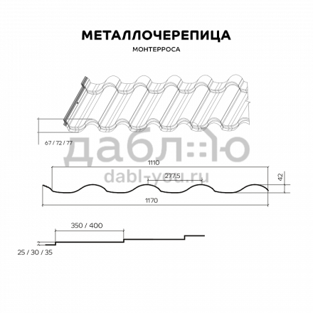 Металлочерепица Металл Профиль Монтеросса. Монтерроса ― самая высокая металлочерепица в ассортименте «Металл Профиль». Её высота достигает 77 мм. Рельефная металлочерепица особенно красиво выглядит на крупных скатах ― она подчёркивает их размеры.Черепица представлена в различных цветах и покрытиях.