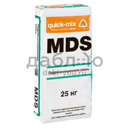 Минеральный гидроизолирующий раствор Quick-Mix MDS, 25 кг. Гидроизоляционный раствор MDS применяется для гидроизоляции выдержанных, прочных, не подвергающихся деформациям, жестких и ровных оснований, таких как: бетон, цементная штукатурка или стяжка, каменная кладка с заполненными швами.- Прочность на сжатие: > 10 МПа