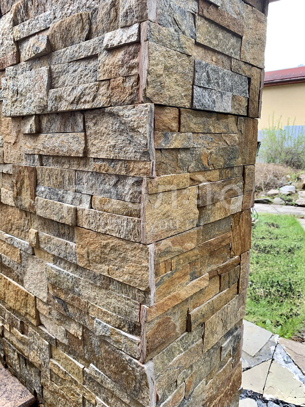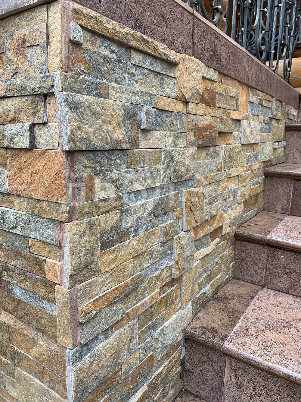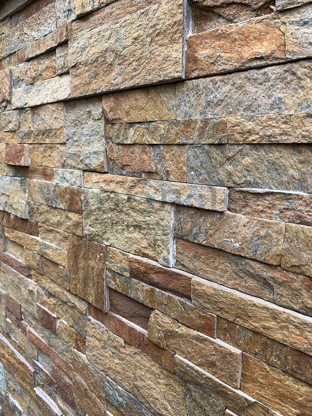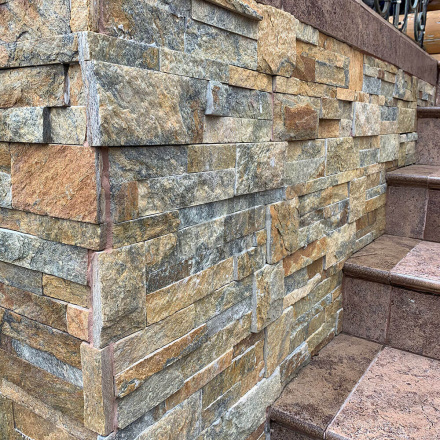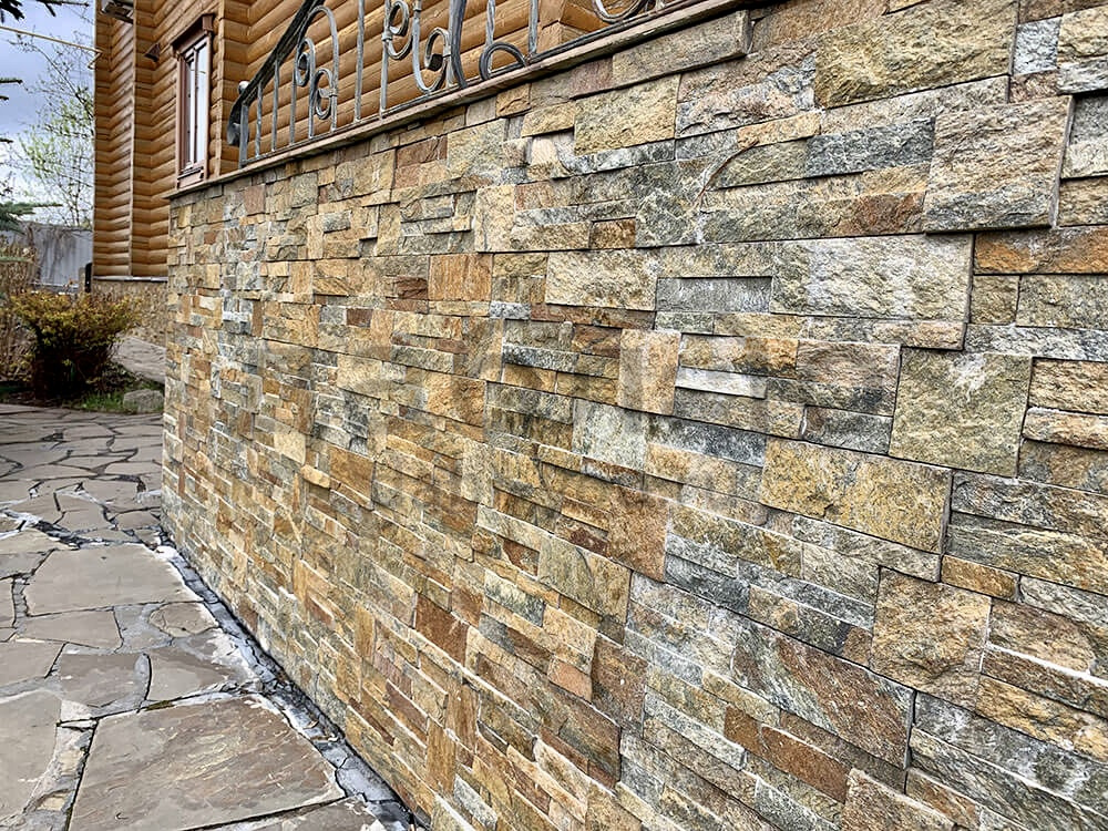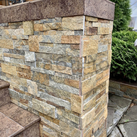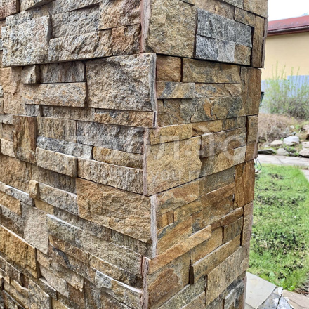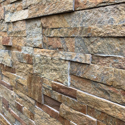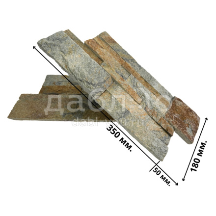 Панель из натурального камня Модерн Кварцит мультиколор. Данная панель представляет собой единую плитку, состоящую из склеенных кусочков натурального камня. Благодаря неровной поверхности достигается "объем" природного материала. Эти панели представлены в различных цветах, что дает возможность подобрать материал на Ваш вкус и цвет.- Длина: 350 мм