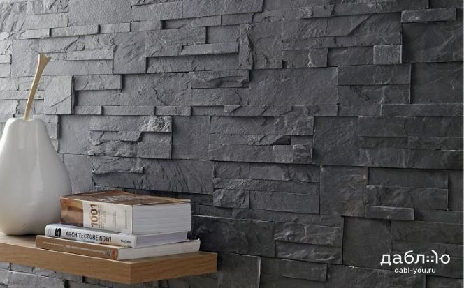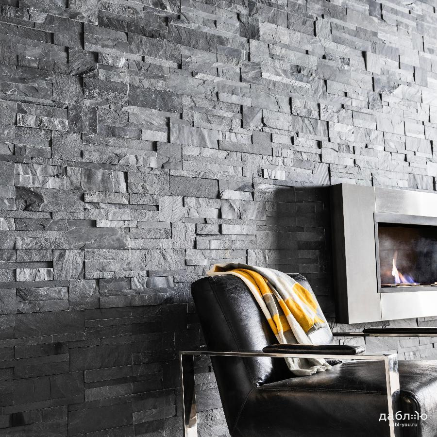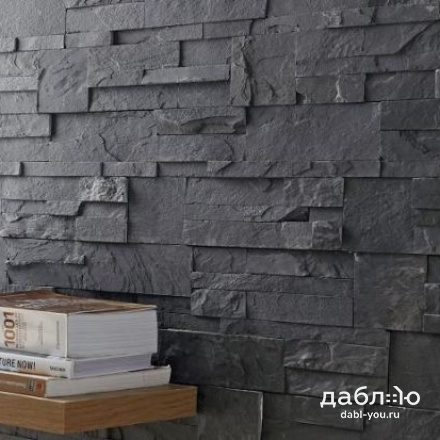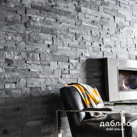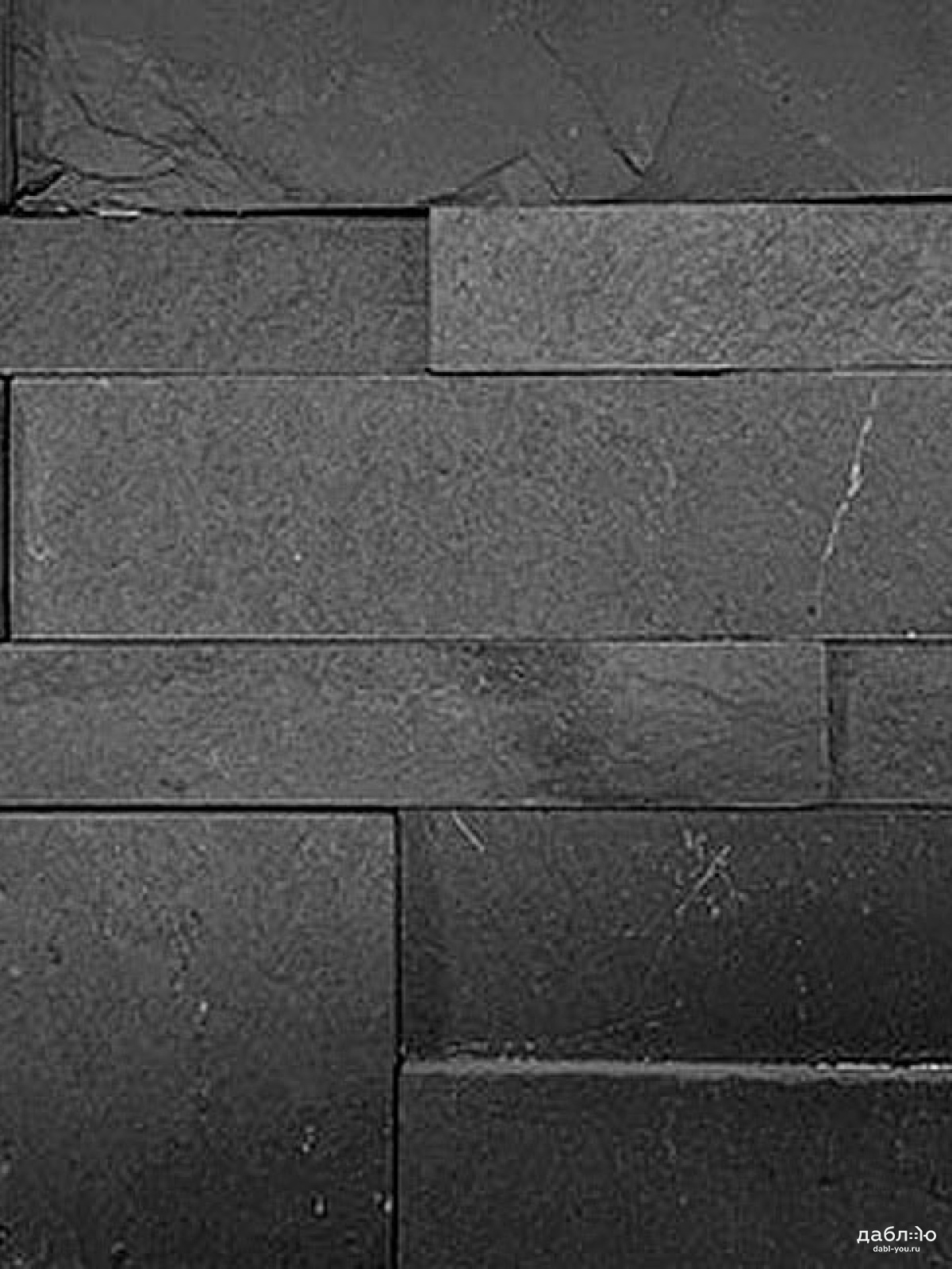 Панель из натурального камня Модерн Сланец черный. Данная панель представляет собой единую плитку, состоящую из склеенных кусочков натурального камня. Благодаря неровной поверхности достигается "объем" природного материала. Эти панели представлены в различных цветах, что дает возможность подобрать материал на Ваш вкус и цвет.Длина: 350 мм