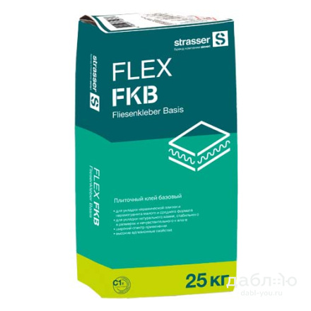 Плиточный клей базовый (C1 T) strasser FLEX FKB, 25 кг. Клеевая смесь для укладки керамической плитки и керамогранита, искусственного и натурального камня, керамической и стеклянной мозаики, на пол и стены. Для внутреннего и наружного применения.- влажность сухой смеси: не более 0,5%
