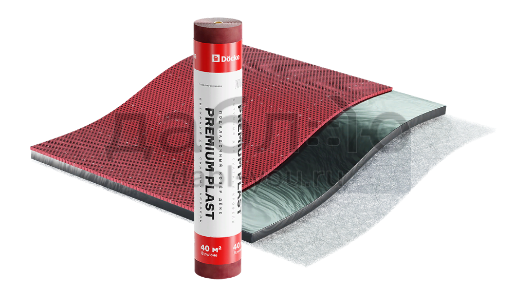 Подкладочный ковер Docke Premium Plast, 40 м. Подкладочный ковер представляет собой рулонный битумный материал, который укладывается на жесткое сплошное основание (OSB-3 или влагостойкую фанеру ФСФ) непосредственно под финишное покрытие. Подкладочный ковер необходим на крыше любой формы, размеров и конфигурации, так как его наличие существенно увеличивает срок службы как самого финишного покрытия, так и всего кровельного конструктива.Характеристики
