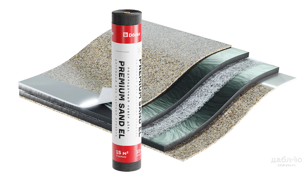 Подкладочный ковер Docke Premium Sand EL, 15 м. Подкладочный ковер представляет собой рулонный битумный материал, который укладывается на жесткое сплошное основание (OSB-3 или влагостойкую фанеру ФСФ) непосредственно под финишное покрытие. Подкладочный ковер необходим на крыше любой формы, размеров и конфигурации, так как его наличие существенно увеличивает срок службы как самого финишного покрытия, так и всего кровельного конструктива.Характеристики