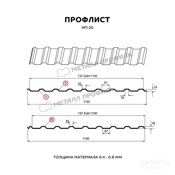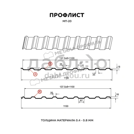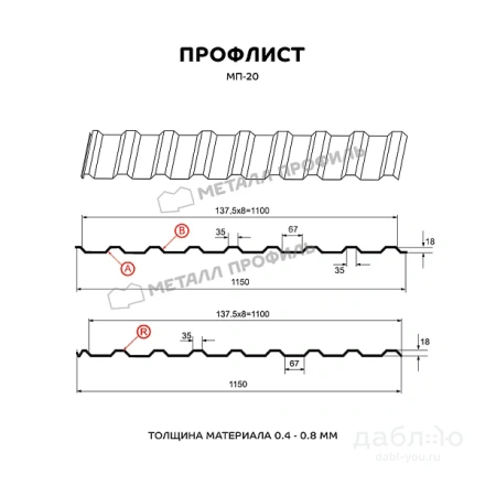 Профлист Металл Профиль МП-20х1100-А,В. Один из классических видов стенового материала. Сегодня данная продукция имеет достаточно широкую сферу применения и используется для облицовки фасадов промышленных и жилых зданий, возведения стен и перегородок, а также в некоторых случаях в качестве кровельного материала. Полимерное покрытие обладает насыщенным цветом, стойкостью к механическим повреждениям и атмосферным явлениям, ультрафиолетовым лучам, благодаря чему профлист долгое время сохраняет свой насыщенный цвет и эксплуатационные качества.Представлен в различных цветах и покрытиях.