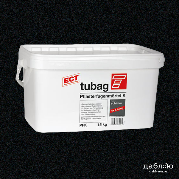 Водопроницаемый раствор для заполнения швов Tubag PFK черный, 15 кг. Готовый к использованию, водопроницаемый раствор для заполнения швов плиточных покрытий на улице. Для швов шириной от 2 мм. Также подходит для брусчатки, плит из натурального камня и клинкерных покрытий.- Прочность на сжатие: ~ 15 Н/мм2 (спустя 7 дней)