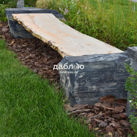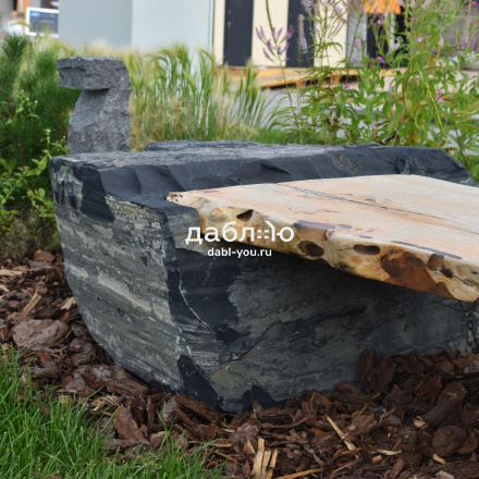 Фактура: природный камень — валуны шунгита, скамья из массива азиатского карагача