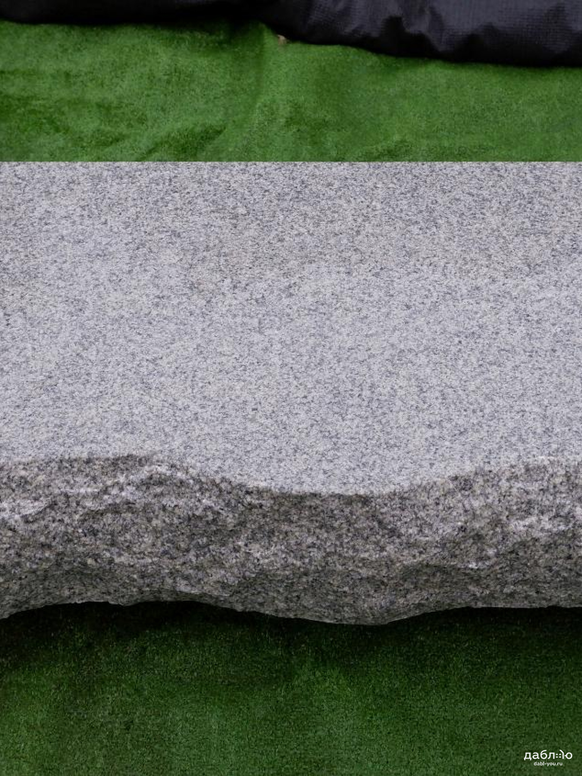 Толстомерная ступень из гранита Мансуровский рубленая. Верхняя грань термообработанная, лицевая грань имеет колотую фактуру, остальные пиленые. Гранитная ступень демонстрирует не только прочность, но и стильный дизайн, вписываясь в различные архитектурные решения.Характеристики