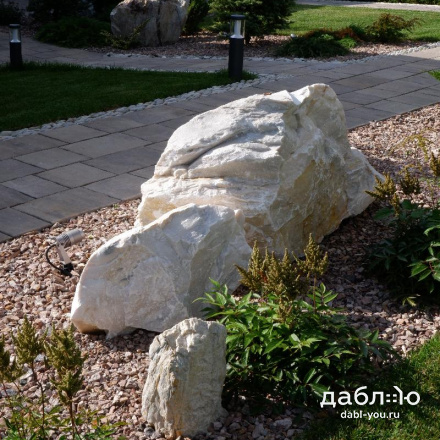 Валун Мрамор молочный. С помощью данного материала создаются цветники, каменистые сады, фонтаны и многое другое. В ландшафтном дизайне глыбы отлично сочетаются с каменной крошкой и применяются как в виде ландшафтных композиций из нескольких камней, так и в качестве отдельных объектов.Область применения: ландшафт